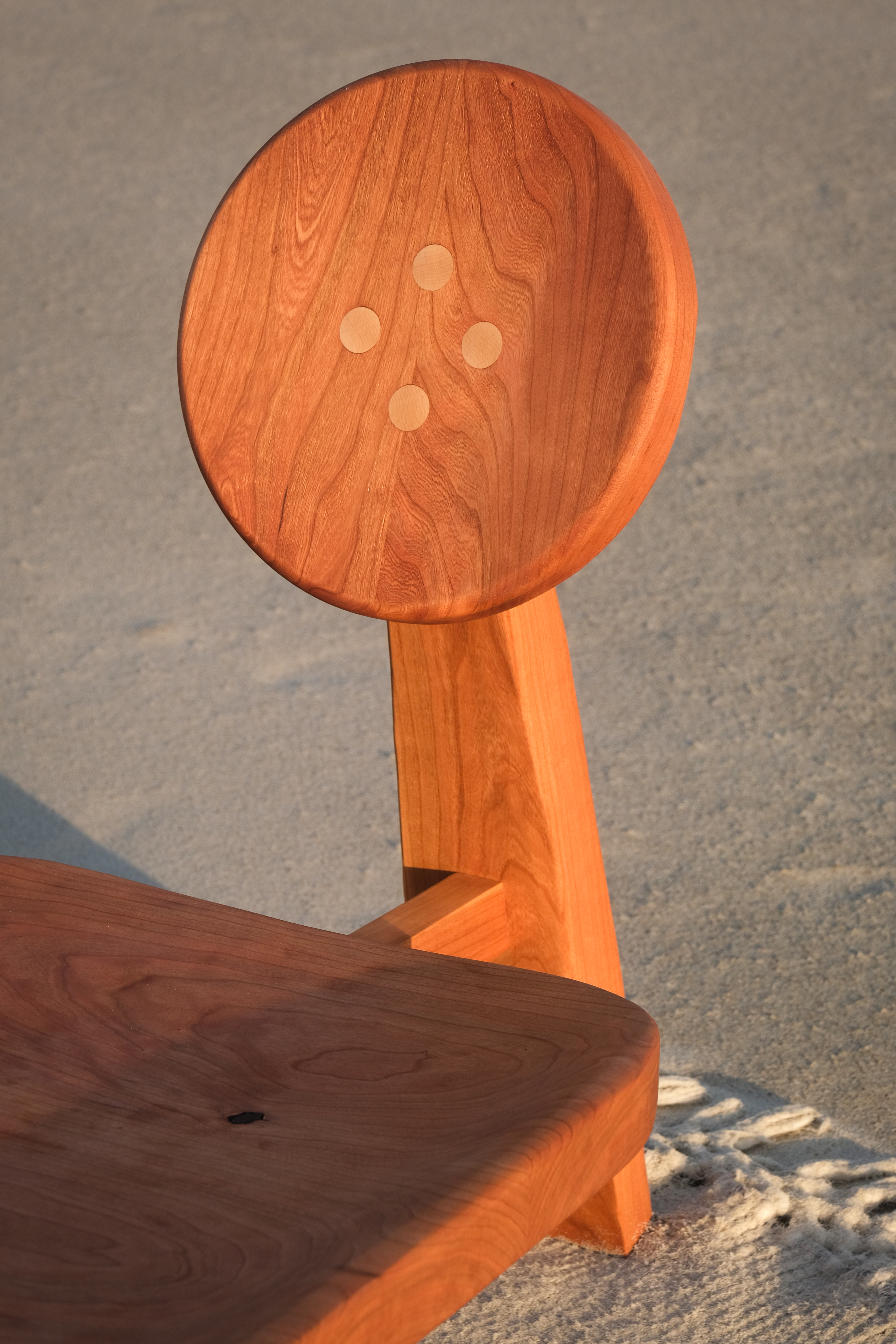 The chair gets its name from the four Maple ornaments that were added to the back to break the monotony of the Cherry wood. This along with the armrest are the only two elements that were made in Maple to contrast the warmth and visual weight of the Cherry, making lighter accents.
